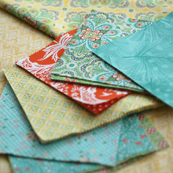 The light yellow print in the background is from Curio, by Basic Grey.  I bought a yard and plan to use it for the background.  (That will be enough for one table topper, but to make a second I’ll have to purchase another yard.)