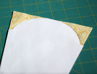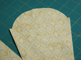 Now cut out the Dresden shape from this other template and place it on top of your wedges. (Save the egg with the tiny slash marks in the margin for the next step.) Trace the curved shape on the top of wedge onto the fabric. Cut along your traced lines. This will give you a lovely scalloped border on your finished piece.