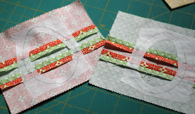 Fuse these pieces to the back or pieced charm squares, lining up slash marks with seam lines. Cut out. Fuse eggs onto Dresden wedges, using the template with for placement. (I could see right through my background fabric, but if you can’t, just lightly press the wedge in half vertically and mark a tiny mark on the fold with a disappearing pen about 1-5/8” from the curved edge to indicate the bottom of each egg and ensure uniform placement.)