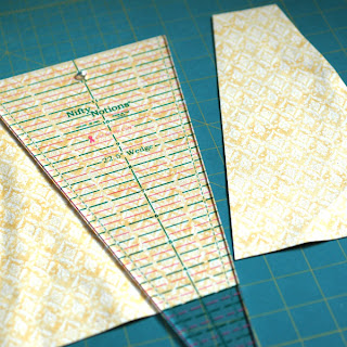 Choose 3/4 yard of a background fabric that complements, but doesn’t overpower, your pieced charm pack. Something that reads as a solid is a good choice. Cut background fabric into 2 (10”) strips. Using this template, cut 16 (sorry – not 20 – I misspoke last week) wedges from the strips (or 32 if you are making two Table Toppers). If you happen to own the 22.5 degree wedge Nifty Notions Cut for the Cure ruler, you can use that too. Simply line up your fabric on the 3” and 13” lines when you cut. (These are kind of “chunky” Dresden Wedges.)