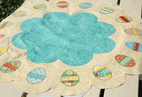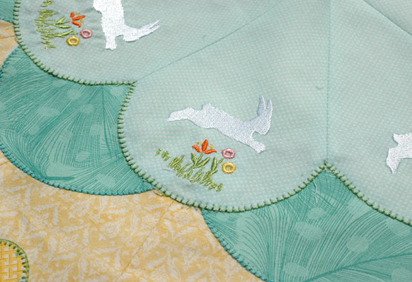 You have two options for the Inner Flower shape. If you have an embroidery machine I have designed a hopping bunny embroidery pattern to stitch on each petal of the flower! To do this, you will actually be stitching out more Dresden Plate blades using your embroidery machine, cutting them out, and assembling them as you did the egg pieces. Eventually this design will make its way to the Bernina site, but in the meantime, feel free to post a message (not anonymously) with the type of file you need at the end of this post and I will email you an .EXP or other type of file.