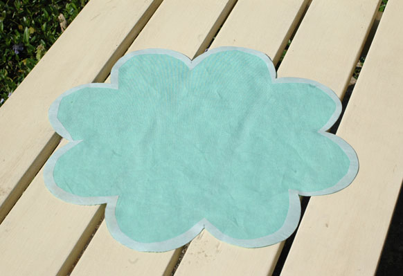 First, print out this Outer Flower Template 4 times and tape it together on the dashed lines. Trace the big flower shape onto paper-backed fusible web. (I used Steam-A-Seam-2 by the Warm Company. If you only have some narrow fusible web you might have to trace it in two halves and that is okay.) Cut out the excess fusible from the center of the shape (there will be a lot and you can use it for another project!) and fuse the remainder onto the wrong side of your Outer Petal fabric.