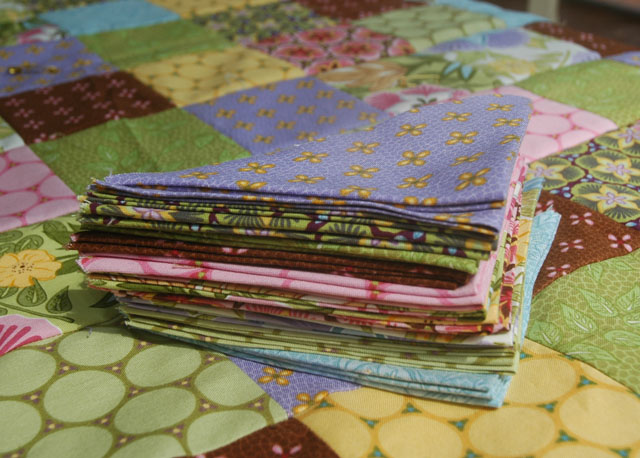 In addition to working on drawings for a new line for Robert Kaufman (and fighting off a cold with the rest of the crew), I’ve been sewing an Ambrosia quilt for a magazine which will be on newsstands later this year. It is a fun, quick-to-piece pattern that you can piece in a weekend that features playful prairie point borders. Now I can’t say which magazine it will be featured in yet, nor can I show you the quilt, but I can show you how to add a prairie point border to this quilt – or any quilt you might be currently working on. My model/assistant has made this lovely pile of prairie points for me to sew into the border of this quilt.