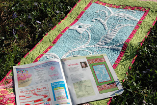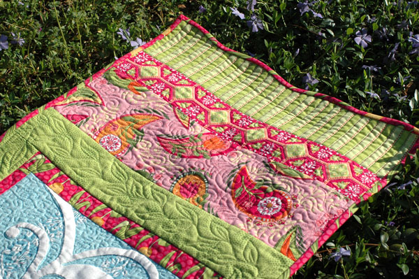 When people ask me my favorite project that I have made over this past year, I usually want to answer that it would be one of my Veranda quilts – most likely either the Under the Veranda Sampler or this Veranda table runner I did for Quilter’s Newsletter. I haven’t been able to show you all the table runner until now! It has a little hand-applique (of course, you could do fusible), a little piecing, a little fussy-cutting, and lots and lots of COLOR!