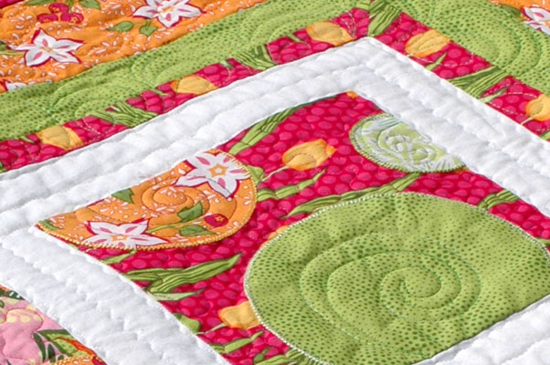 I used a thick, contrasting 12 wt. Sulky cotton for the applique, and love how it looks. A few shop owners have remarked that this would be good to use for an embroidery class. One sewer remarked that she was planning on using all the specialty stitches on her machine to attach the circles. Why didn’t I think of that? I guess I’ll have to make another quilt… Another quilt- that is definitely what every girl needs, don’t you think?