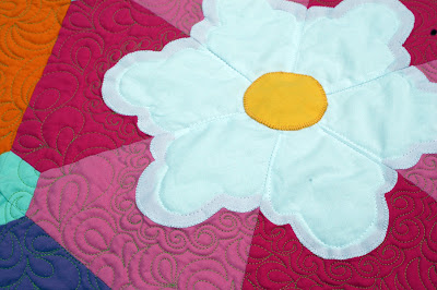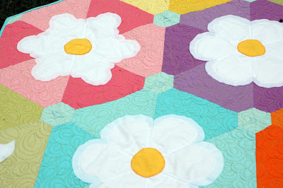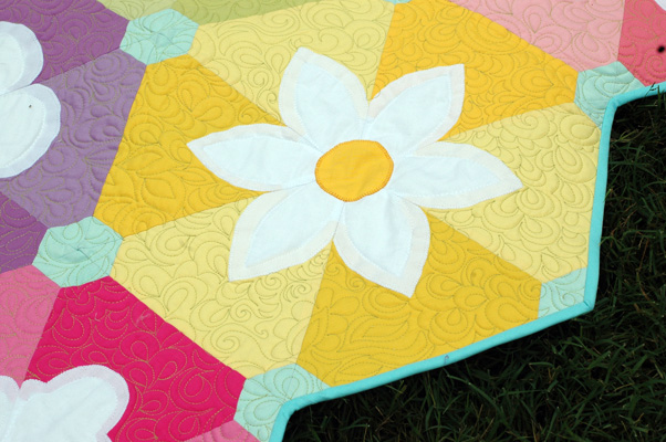 She is 74″ x 96″ and her Kona rainbow palette makes me happy. Her big, varied, blossoms make me happy. She uses big 8″ triangles (gotta keep it simple somehow) cut using a 60 degree Creative Grids ruler and I love her. Really really love her.