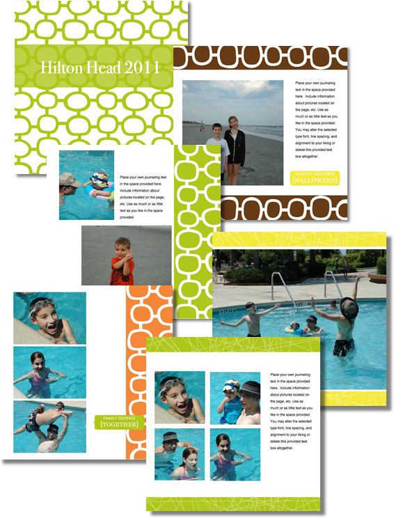 I played around with the software this week.  (To see more info about the actual software click here. They gave me a code for you to enter at checkout to get $10 off – STMMMS36473.)  Anyway, you  can use it to make lots of things – photo albums, cards, invitations.  My favorite feature was the ability to select a bunch of photos, select a book design, and watch as it automatically thread the photos throughout – like this….