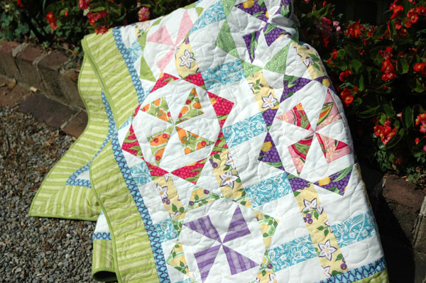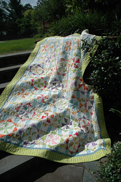 For Issue 6, which comes out early next week, I designed a quilt called “Virginia Reel” in my Veranda line. I called it that because it is comprised of dozens of pinwheels that seem to spin between pairs of columns, just like dancers in a reel.