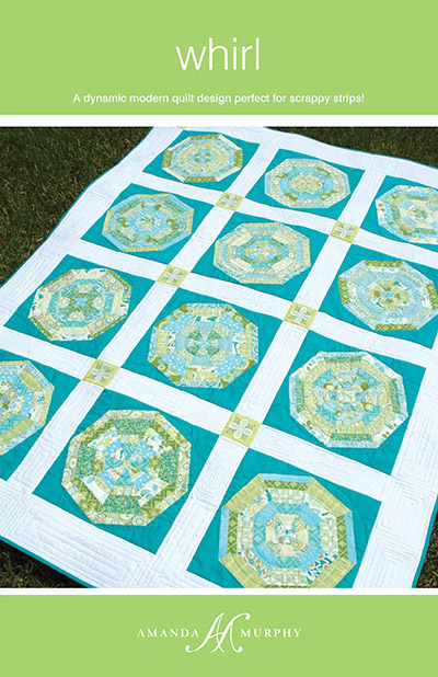 Next is Whirl. It is sewn out of Bella along with Kona Cottons and some Vanessa Christenson prints. It is super simple to piece since you sew strip sets, cut them into Kaleidescope blocks, and place them on point. Embroidery is just used as little cornerstone accents, but you can also use a feature print.