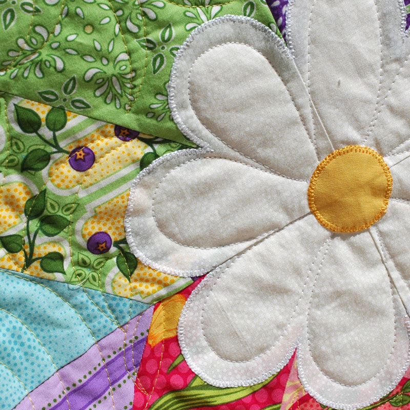 So, now I am faced with either a) making the border narrower OR b) zigzagging an inch or so into the quilt to secure the damage. I am leaning toward the latter as I think I love my border more than some delusion that future generations will consider me an expert quilter. (The quilting itself was done by Deborah Norris – didn’t she do a fabulous job? She accentuated the blossoms shapes and did freehand flowers and vines on the background.)