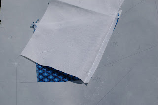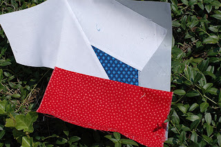 When you enlarge the pattern Section A will JUST fit onto a sheet of 8-1/2” x 11” paper. Just center it so that you have a 1/4” seam allowance on both sides when you trace. You’ll need scraps of red, white, and blue fabric, and scraps of white background fabric. You’ll also need two white rectangles 4-1/2” x 8-1/2”. I chose to use red fabric for pieces A4 and C1 and D1. A5, A1, B1, and D4 were various shades of blue. The rest of the pieces was white. (The blues I used were from “Blue Eden”, designed by Maria Kalinowsky for Bernatex. The red was from my stash and I used Kona White Organic cotton.)