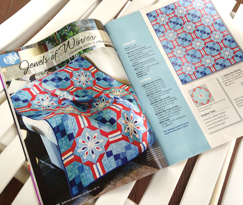 This quilt I designed based off of an applique snowflake block is on newsstands now in the fall 2013 issue of Quiltmaker’s Quilts from 100 Blocks.