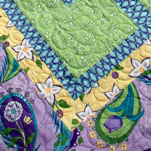 My friend, Pat Hopkins, mitered the corners on her version of Town Square. Didn’t she line up the stripes nicely? (I am not that patient so I’m glad you sewed this one, Pat.) Please excuse the out of focus photo but I was focusing elsewhere on the quilt and don’t have it back yet to stage a re-shoot.
