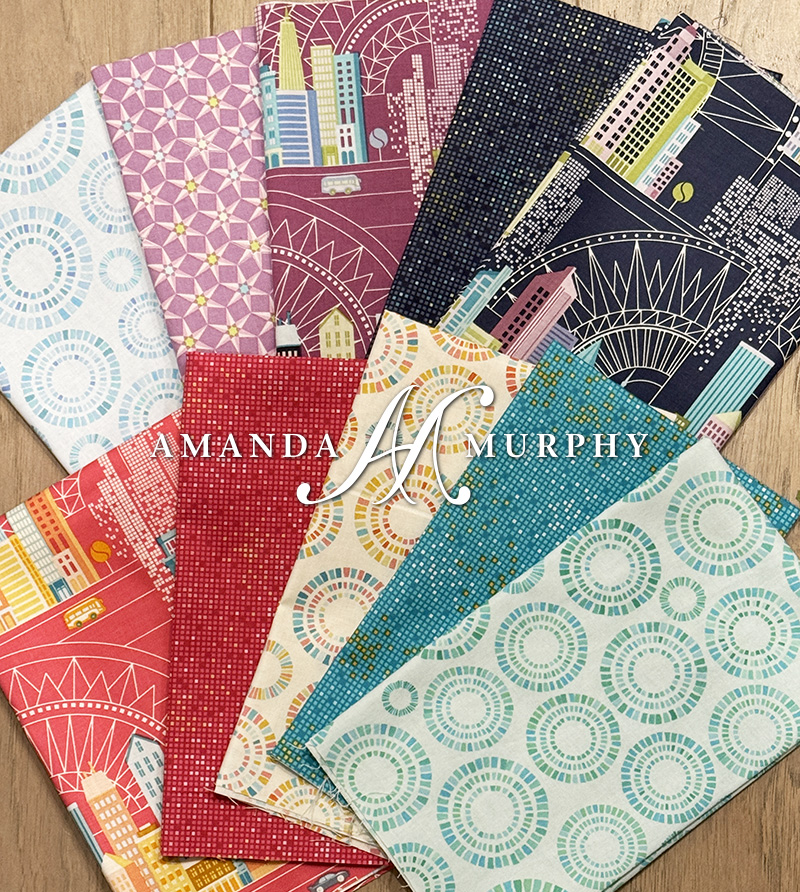A taste of fabrics from Amanda’s Cityscape collection. These bundles include 10 fat quarters of coordinating prints. Actual fat quarter fabrics may vary slightly from the examples shown in the photo.