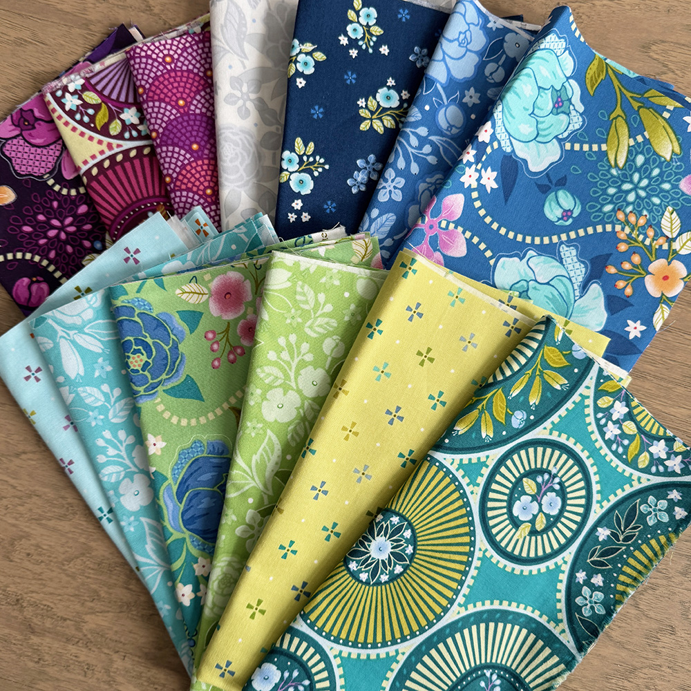 A taste of fabrics from Amanda’s Frolic fabric collection. These bundles include 13 fat quarters of coordinating prints. Actual fat quarter fabrics may vary slightly from the examples shown in the photo.