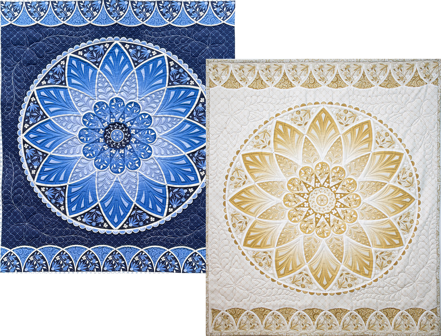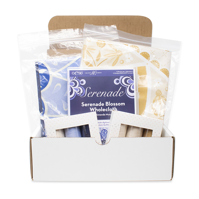 Exclusive project kit featuring 1 Moonlight and 1 Cream Serenade Blossom Panel by Amanda Murphy for Benartex, 6 spools of coordinating Perfect Quilting Thread & custom wholecloth quilting design (BQM & EXP formats on a USB).
