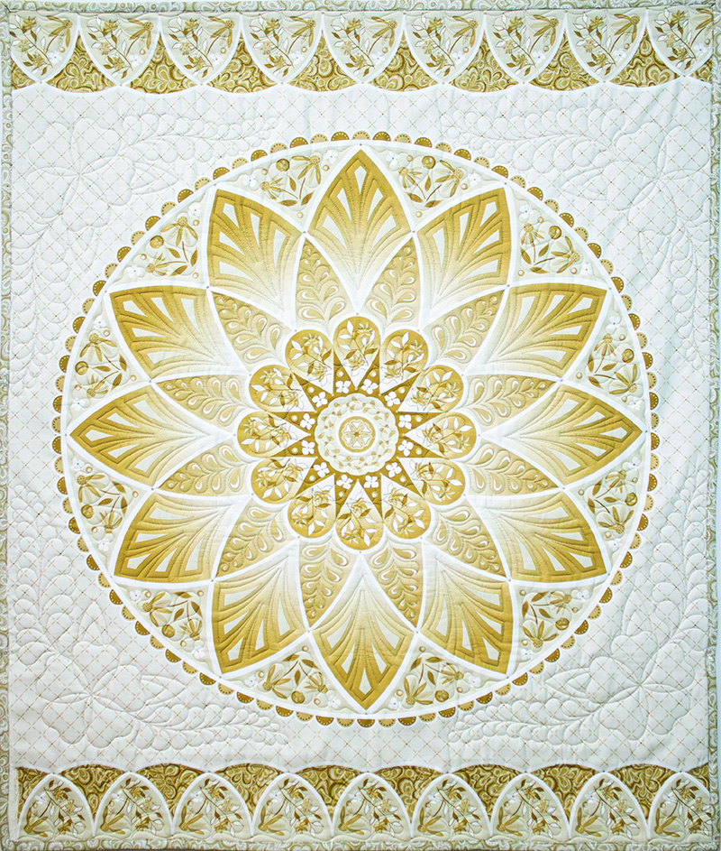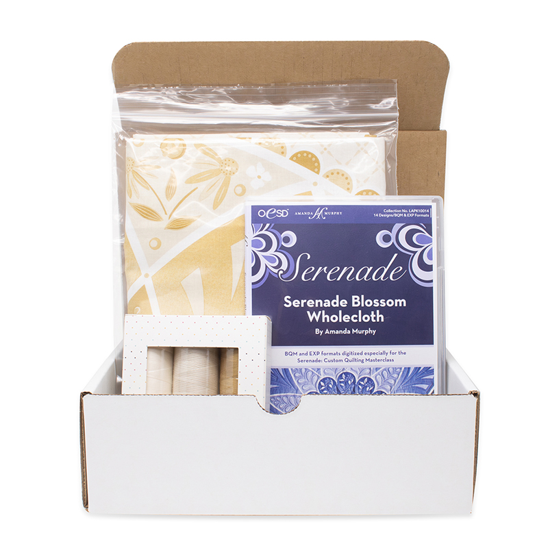 Exclusive project kit featuring 1 Cream Blossom Panel by Amanda Murphy for Benartex, 3 spools of coordinating Perfect Quilting Thread & custom wholecloth quilting design (BQM & EXP formats on a USB).