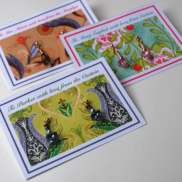 There has been a mad flurry of activity here since Sunday evening, when the kids’ last Nutcracker performance of the year wrapped up. We always have lots of ideas for gifts, but run out of time to make them all. This year, Caitrin came to the rescue with beaded earrings. (I don’t know a thing about beading, but she let’s me think I am helping by choosing beads and making packaging. She does all the hard stuff. Thanks, Cait!)