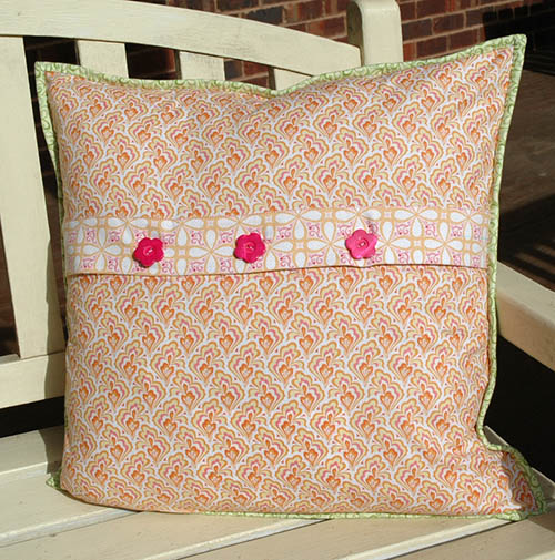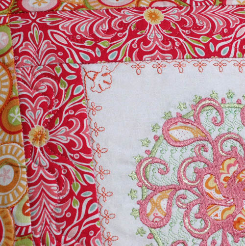 I used the 780‘s fancy stitches to add detail around the edge of the middle panel. I also used the endless embroidery option for quilting – you can see it a little in the bright pink border. The endless embroidery option allows you to take ANY of the hundreds of stitches on the 780 and size it up to use for a continuous embroidery design. It is a great option for creating a unique quillting motif – particularly for borders.