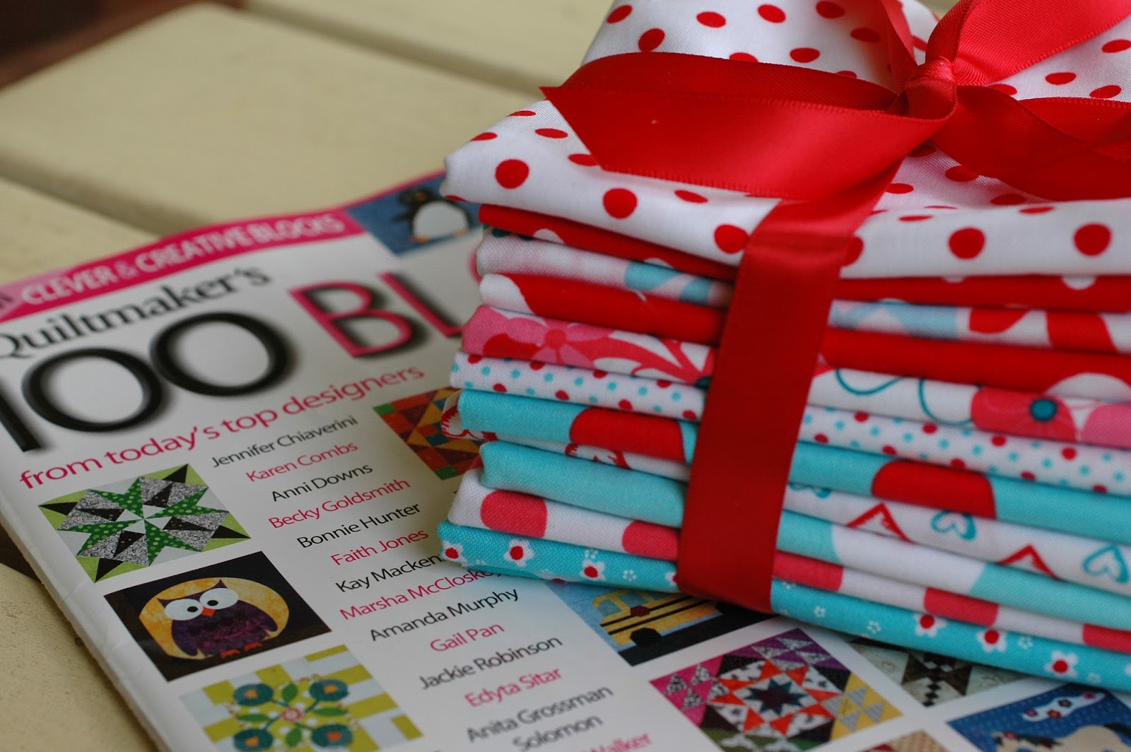 Quiltmaker’s 100 blocks Volume 7 will be on newsstands on May 7th, and Quiltmaker is allowing me to giveaway an issue! I’m also going to throw in a beautiful fat quarter bundle of Michael Miller Red and Aqua fabrics. I used these fabrics in a quilt in Modern Holiday called Crossroads that recently put in an appearance at Quilt Con with C&T Publishing. I’ve been cutting up and assembling bundles for giveaways at my two Schoolhouses at market and I have an extra!